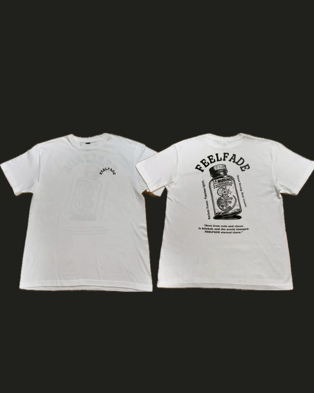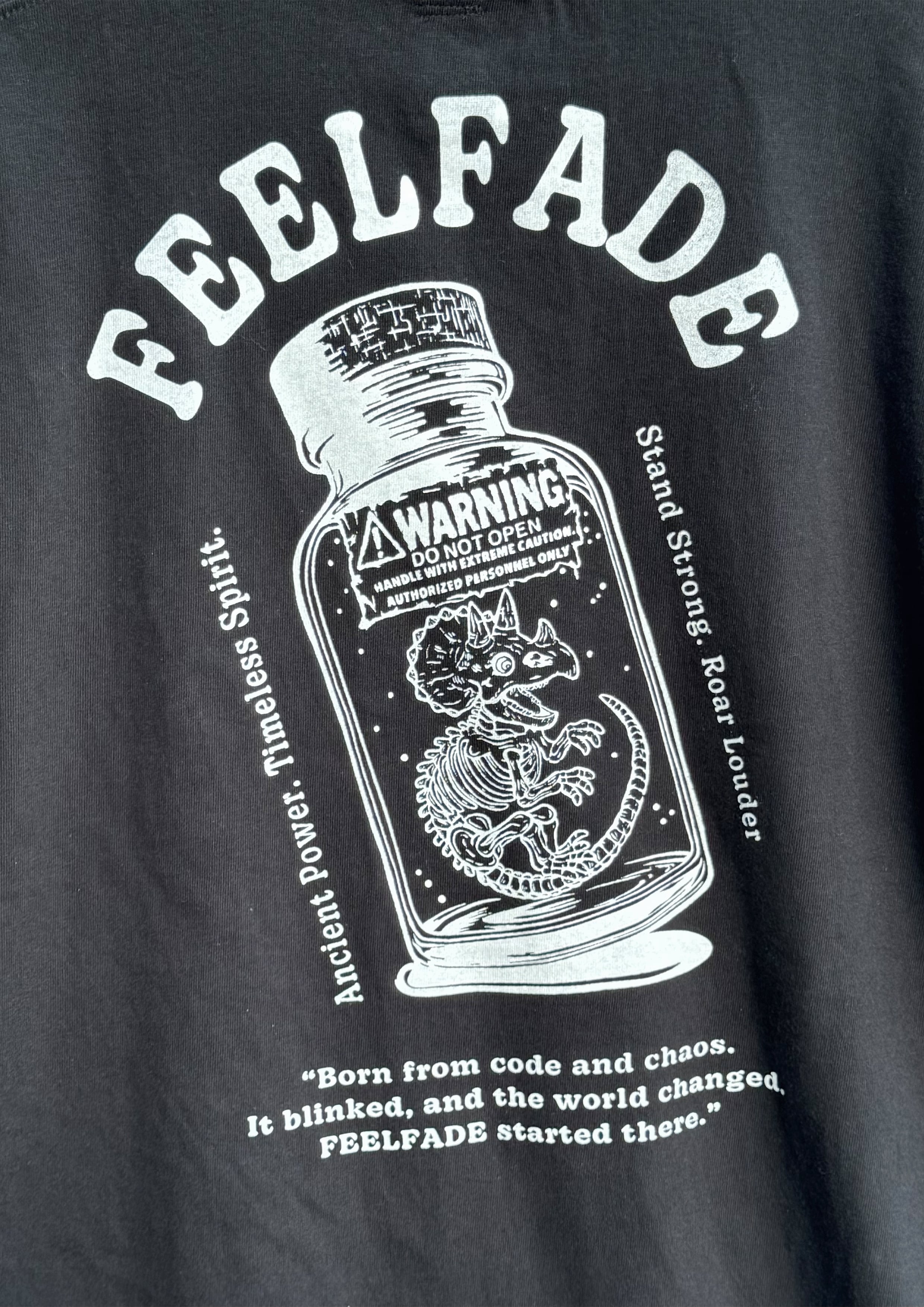 背中に大胆にプリントされたTriceraを閉じ込めた瓶。まるで禁断の薬瓶を開けるような、FEELFADEらしい世界観を閉じ込めました。